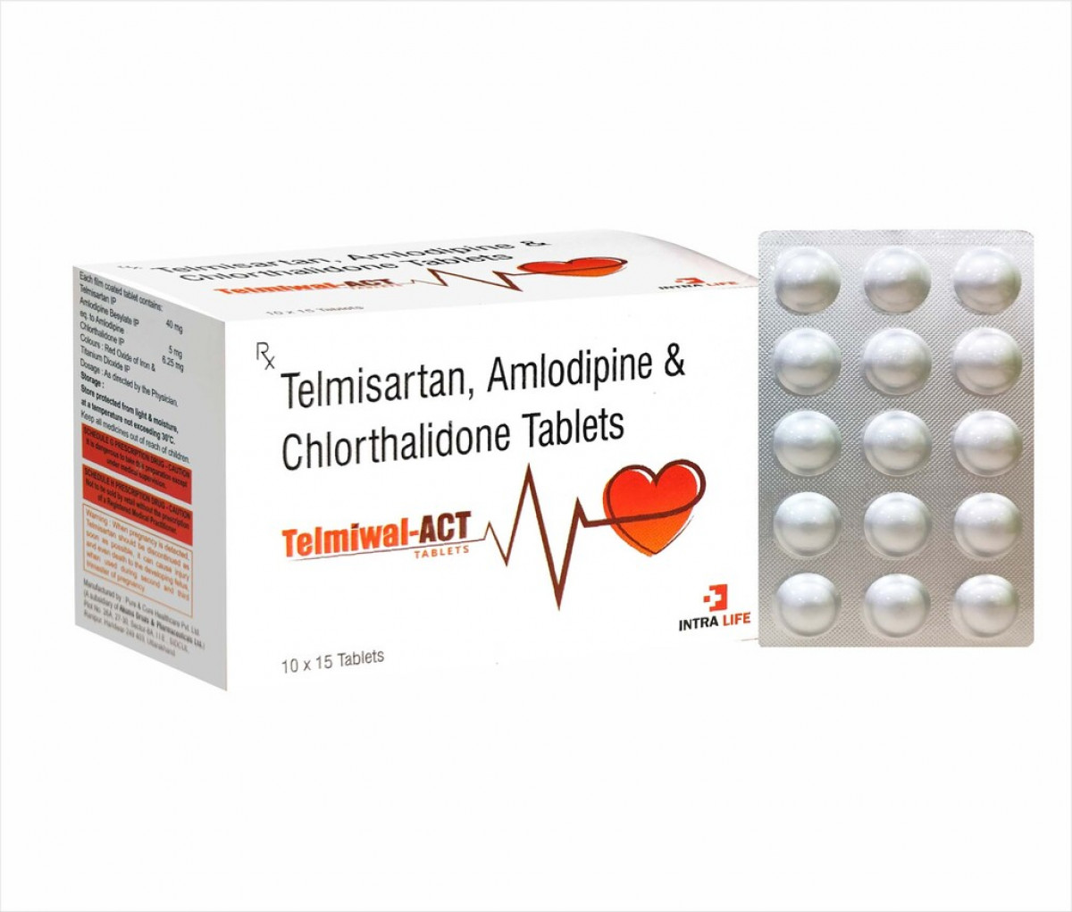 Telmisartan IP 40mg + Amlodipine 5mg + Chlorthalidone IP 6.25mg is a potent triple-combination therapy designed for the effective management of hypertension (high blood pressure). This medication combines the benefits of three active ingredients: Telmisartan, an angiotensin II receptor blocker (ARB) that relaxes blood vessels; Amlodipine, a calcium channel blocker that helps to dilate arteries; and Chlorthalidone, a thiazide-like diuretic that helps reduce excess fluid and sodium in the body. Together, they work synergistically to lower blood pressure, reduce the risk of cardiovascular events such as heart attack and stroke, and improve overall heart and kidney health. This combination is often prescribed when single or dual therapy is insufficient to control blood pressure.