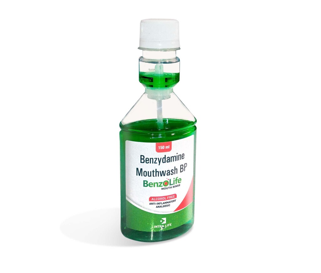 Benzydamine HCl 0.15% w/v Mouthwash is a locally acting non-steroidal anti-inflammatory mouth rinse. It provides rapid relief from oral pain, inflammation, and irritation caused by conditions such as sore throat, mouth ulcers, gingivitis, dental procedures, and oral mucositis. Benzydamine has analgesic, anti-inflammatory, and local anesthetic properties, helping to soothe sore, swollen tissues and reduce discomfort without systemic side effects.