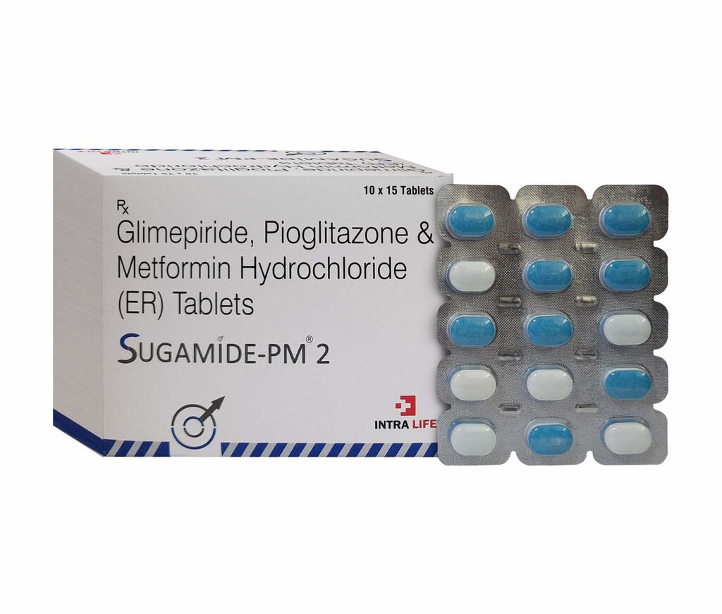 This triple combination tablet contains Glimepiride 2 mg, Pioglitazone 15 mg, and Metformin Hydrochloride 500 mg in Sustained Release (SR) form. It is formulated to provide comprehensive glycemic control in patients with type 2 diabetes mellitus, especially those not adequately managed by dual therapy.